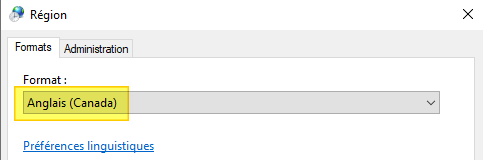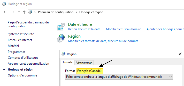 | 1. Open the regional settings in control panel. In this example, the server is configured to use the French format (Canada). ![]() |
